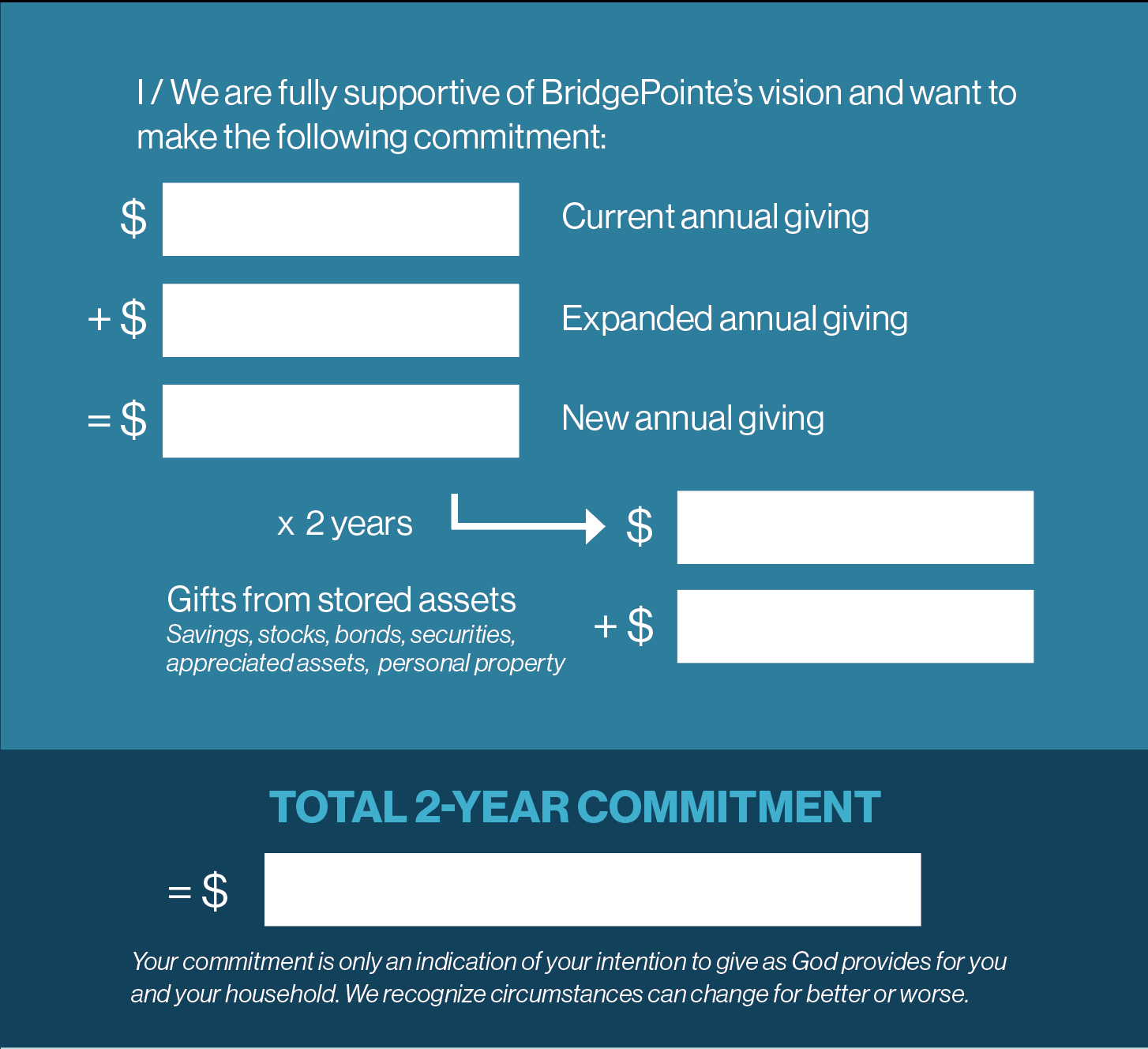 As we trust God to move through us, we invite every person in our church to take a step of deeper commitment. Please use the commitment card example below and watch the video to understand how to arrive at your two-year commitment number.